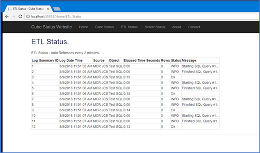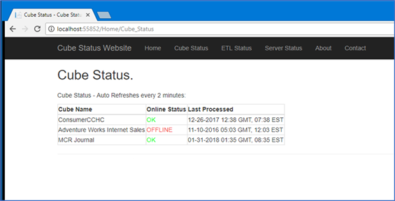 Cube Portal – I built a cube status web portal in ASP.NET MVC that displays the online and last processed date time of reporting cubes as well as the ETL logging information and status. Using the SQL logging system I developed.